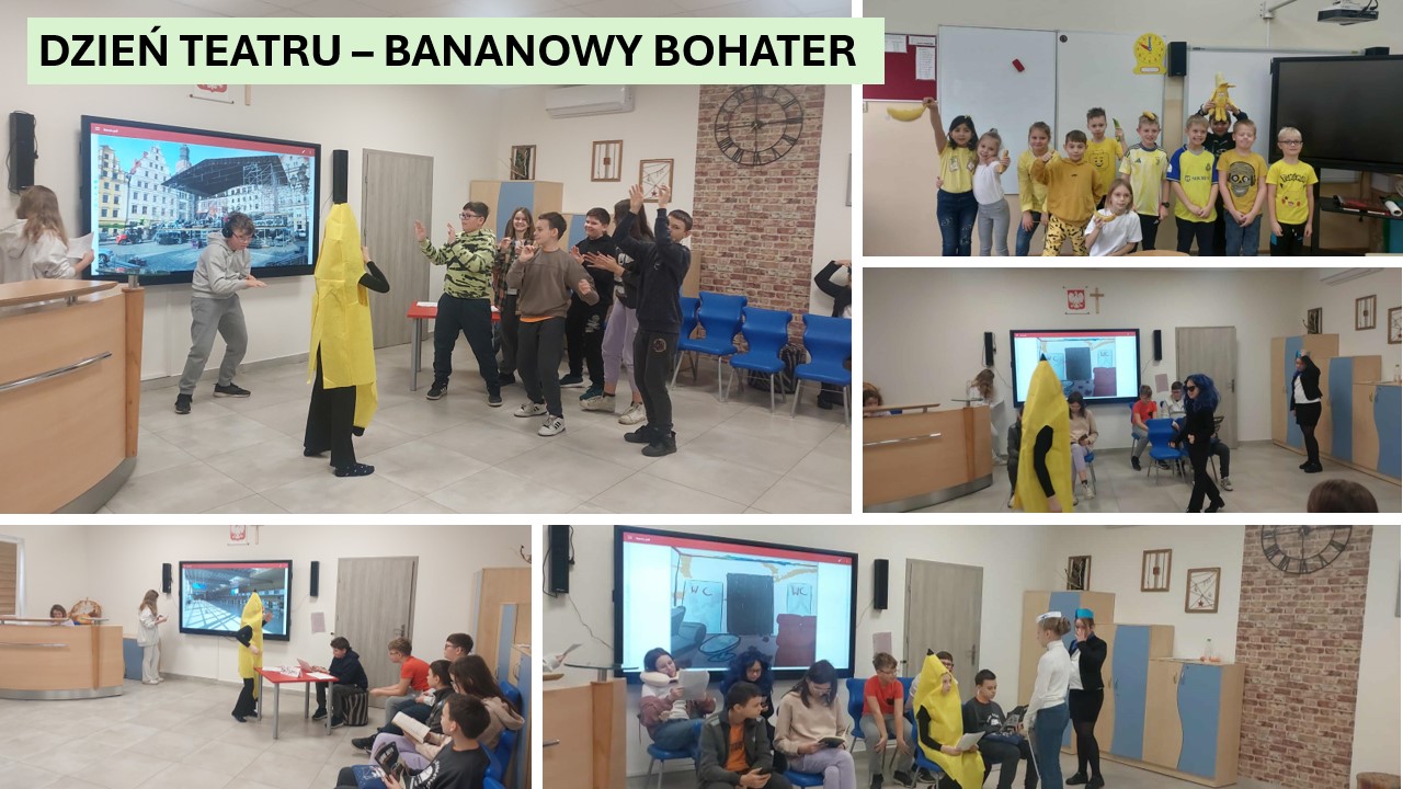 Nietypowym dniem okazał się czwartek. Na korytarzach szkolnych pojawił się kolor żółty, a najmłodsi przynieśli ze sobą pluszaki w kształcie banana. Był to przewodni temat tego dnia, gdyż uczniowie klasy V zorganizowali przedstawienie dla całej szkoły, oparte o historię “Banana” napisanej przez uczennice tej klasy. Występ ten zachwycił i zainspirował szczególnie młodszą publiczność do stworzenia własnej historii.